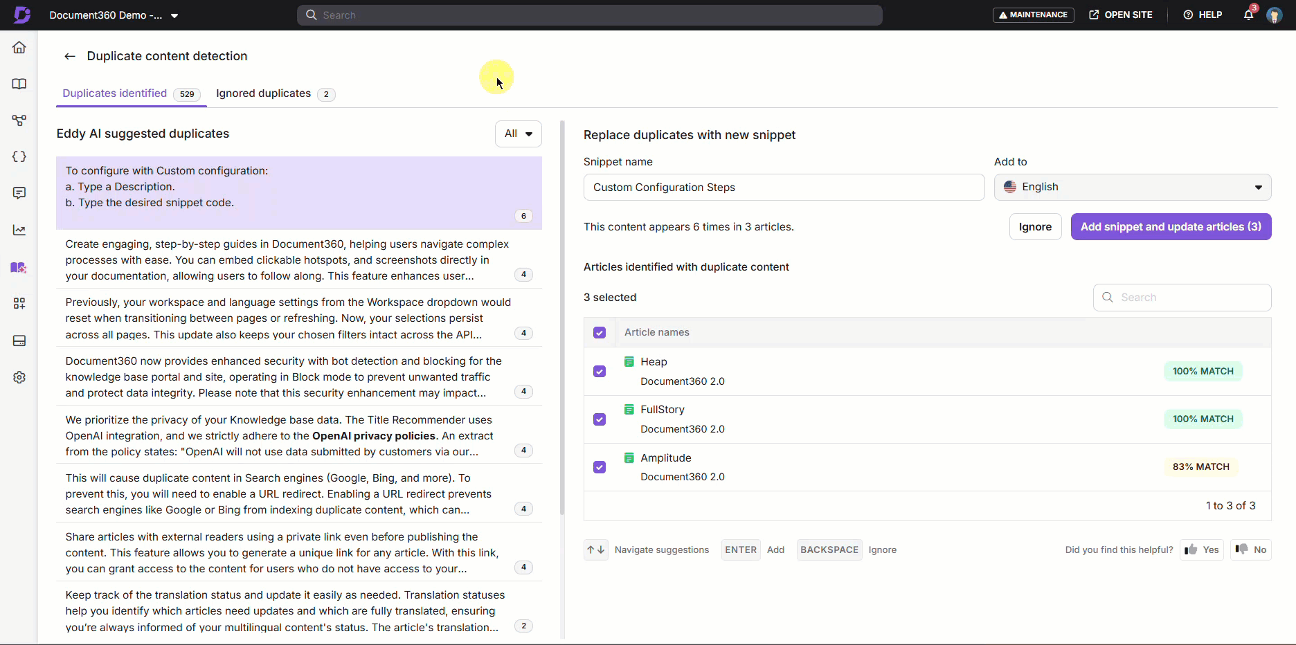 Click Add snippet & update articles to replace the duplicate content in all the listed articles.
