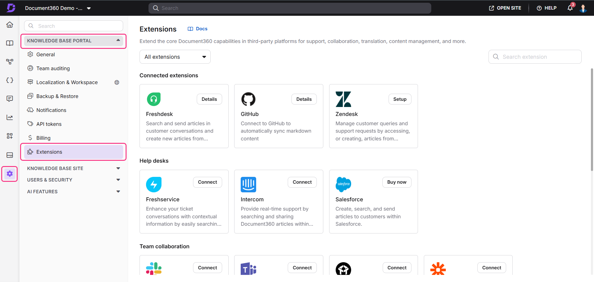 Las extensiones de Document360 mejoran la funcionalidad de su base de conocimientos al integrarla a la perfección con plataformas de terceros, lo que permite un flujo de trabajo más conectado y eficiente. Estas extensiones le permiten acceder, administrar y compartir el contenido de la base de conocimientos directamente desde otras plataformas, lo que reduce la necesidad de cambiar entre herramientas. Al integrar Document360 con sus herramientas existentes, puede optimizar las operaciones y mejorar la colaboración entre equipos.