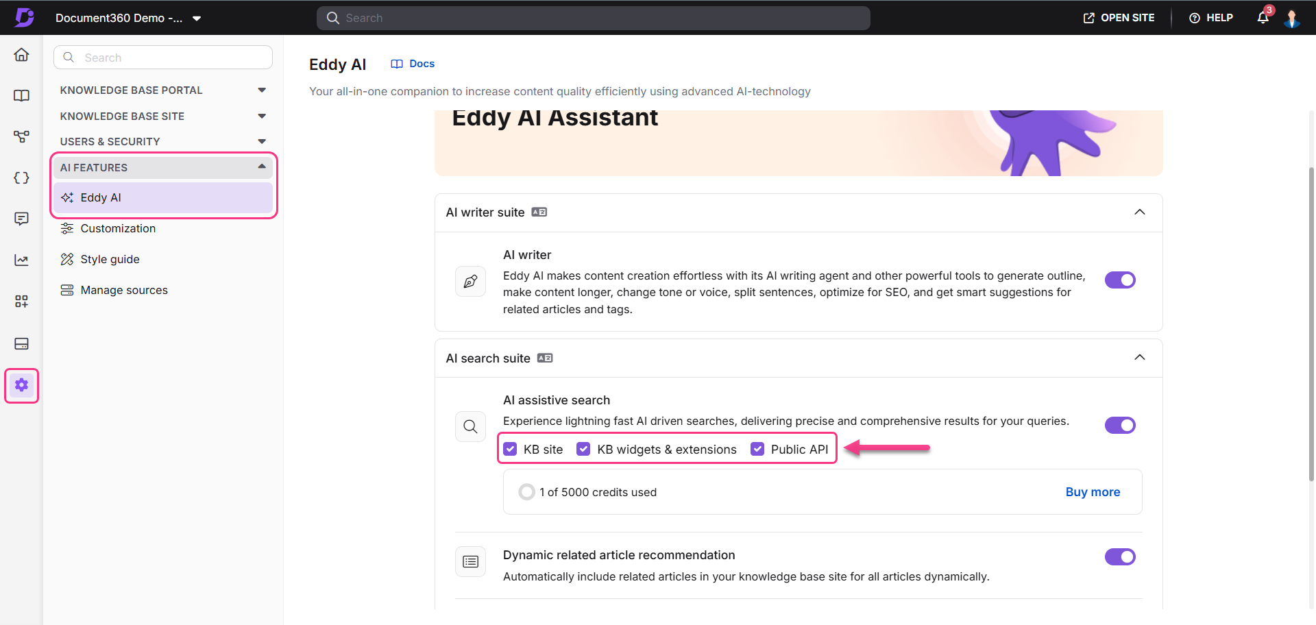 En el panel de navegación izquierdo, vaya a Características de la IA > Eddy AI.