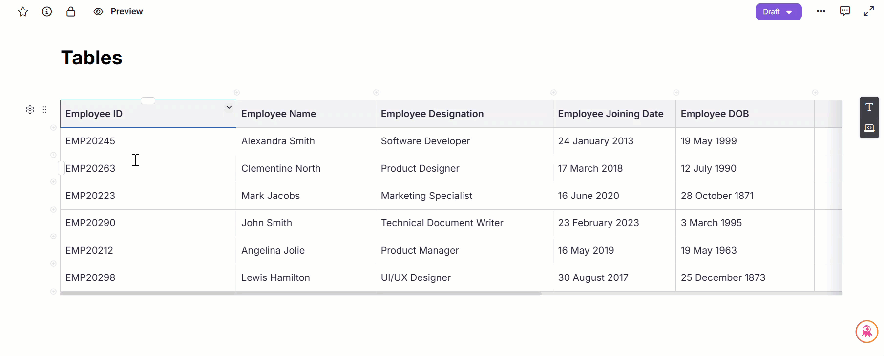 A table displaying employee details with options to insert or delete rows and columns.