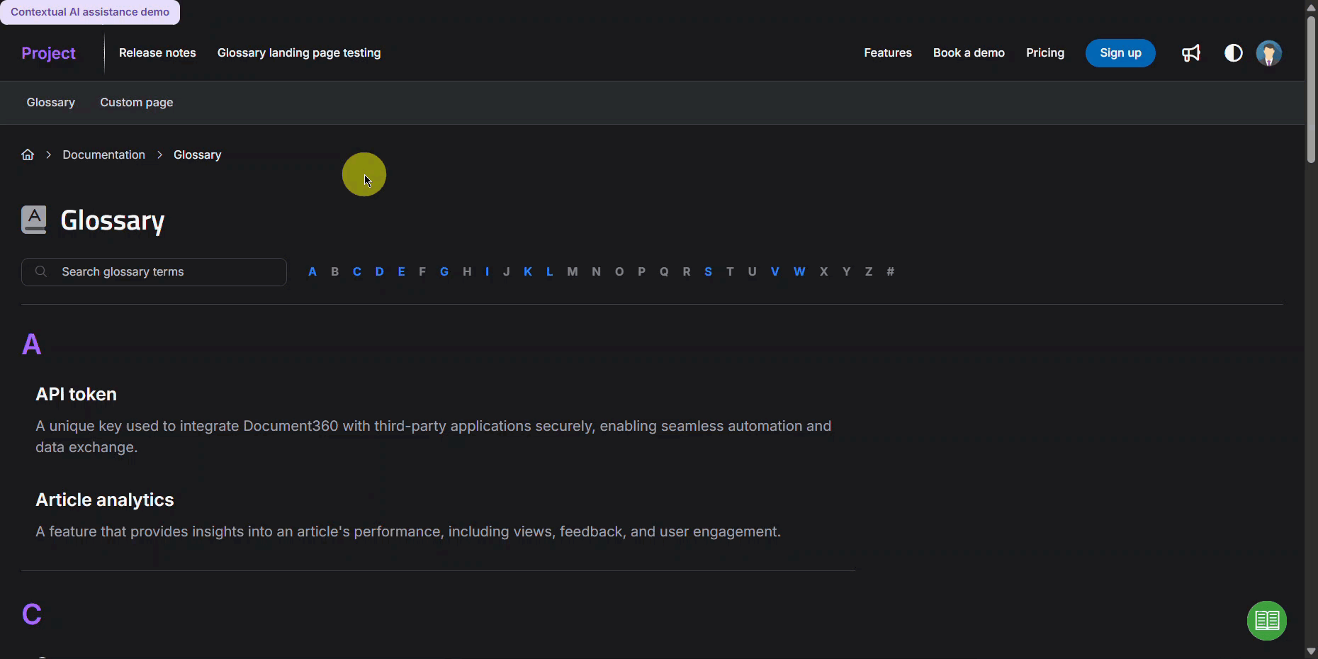 La opción Asistencia contextual de IA le permite mostrar indicaciones impulsadas por IA en el widget de la base de conocimientos. Según su configuración, estos mensajes pueden aparecer cuando los usuarios hacen clic en un botón o automáticamente cuando abren una página específica junto con la respuesta a los mensajes.