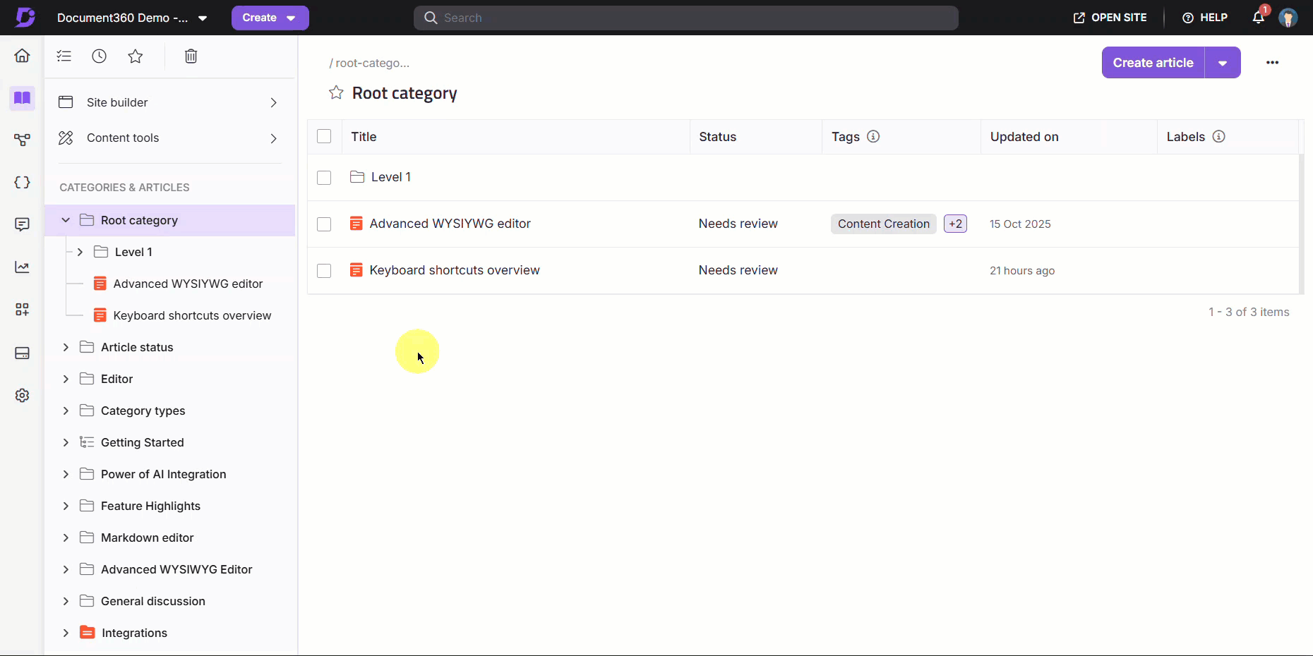 Artículo para mostrar : en la barra de búsqueda, seleccione los artículos o categorías que desea mostrar en la documentación de la base de conocimientos.