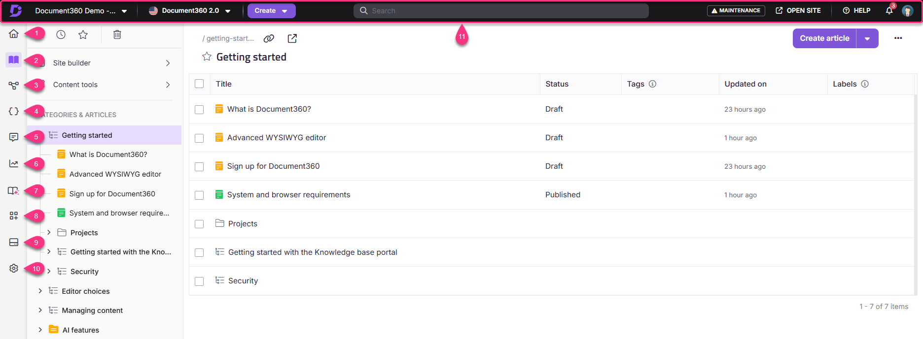 La section Documentation est l’endroit où vous créez et organisez la structure de votre base de connaissances. Il inclut des outils pour gérer des catégories, sous-catégories et articles, ainsi que l’accès à des domaines de gestion de contenu tels que All articles, Recent, Starred, Recycle bin, Site builderet Content tools.