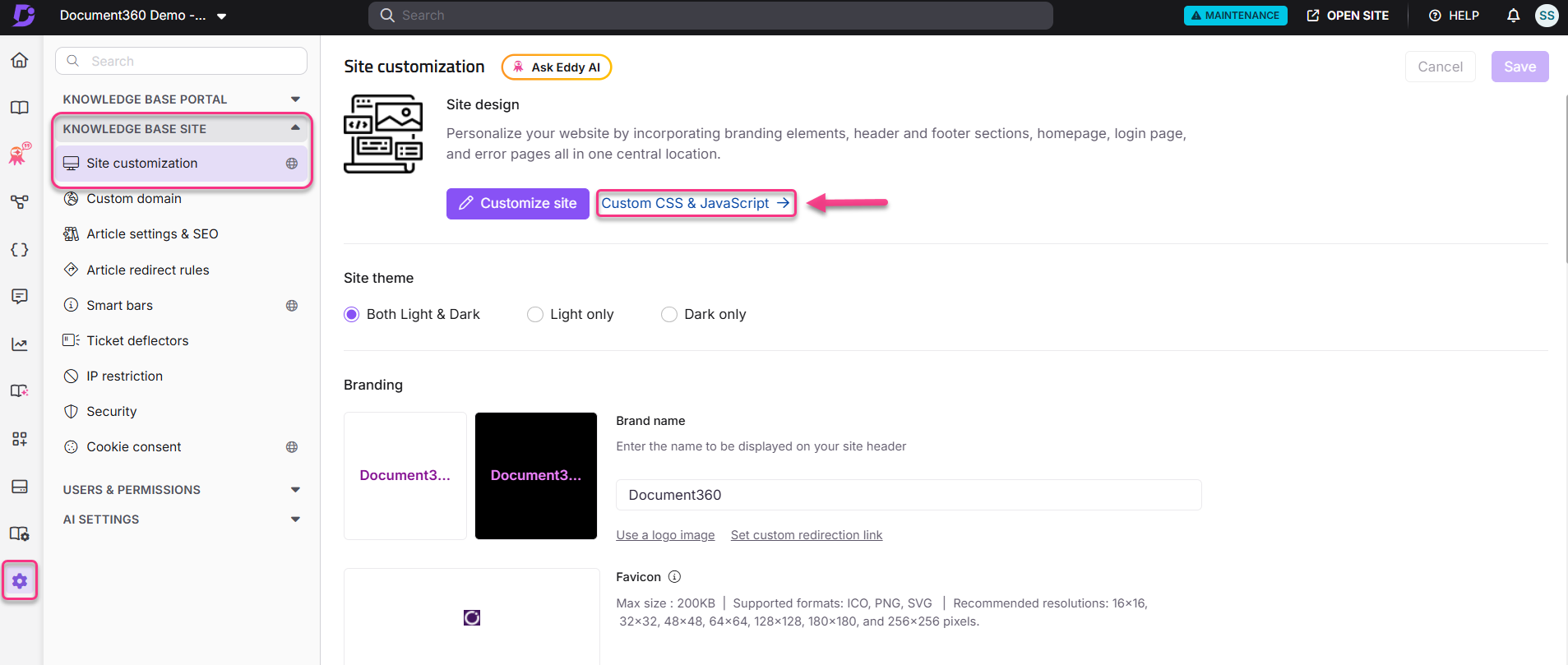 Sur la page Site customization , cliquez sur CSS & JavaScript personnalisés.