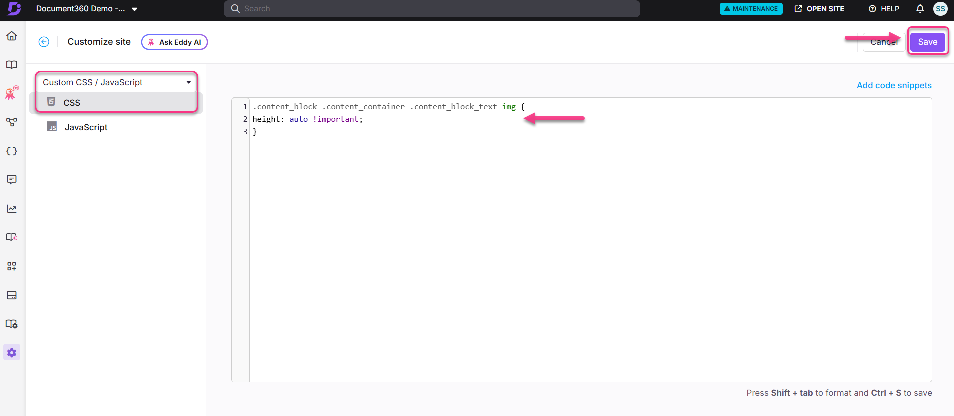 Dans le volet de gauche, cliquez sur CSS et collez le extrait CSS suivant dans l’espace de code :