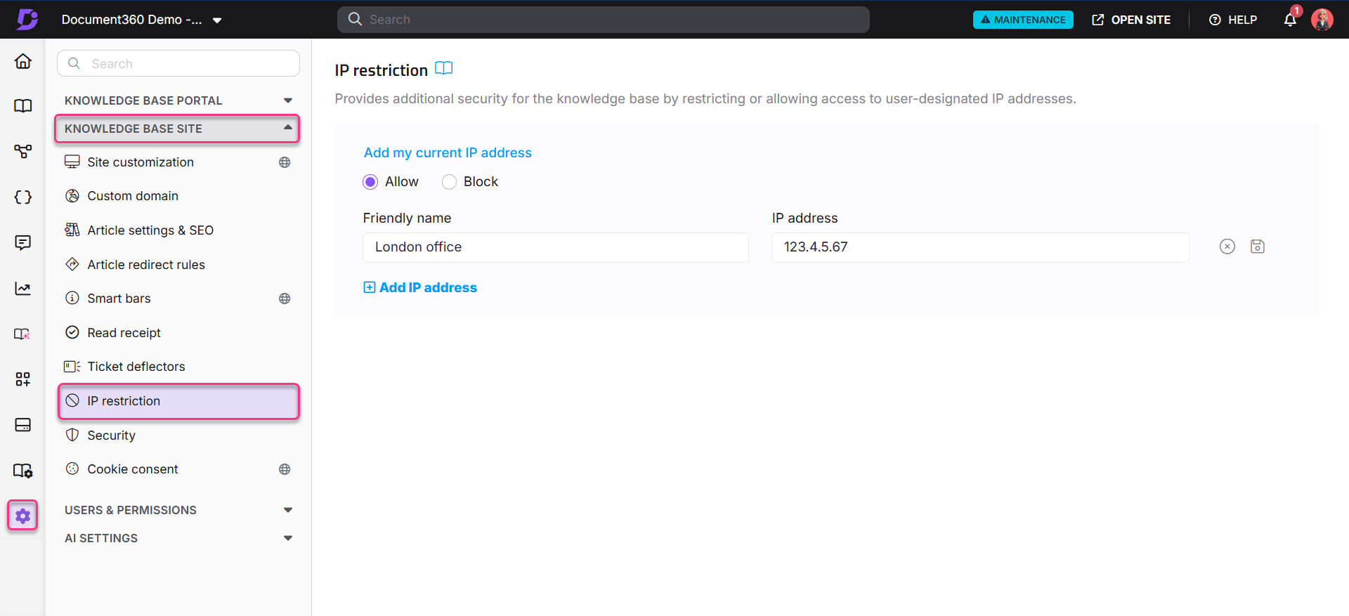 IP restriction adds an extra layer of security to your knowledge base by allowing or restricting access based on user-specified IP addresses.