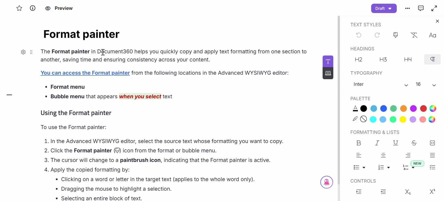 Wanneer je een artikel maakt, geef je er een naam aan. In de Advanced WYSIWYG-editor verschijnt de artikeltitel bovenaan het inhoudsgebied van het artikel. Klik op de titel om het te bewerken. Je ziet de volgende opties: