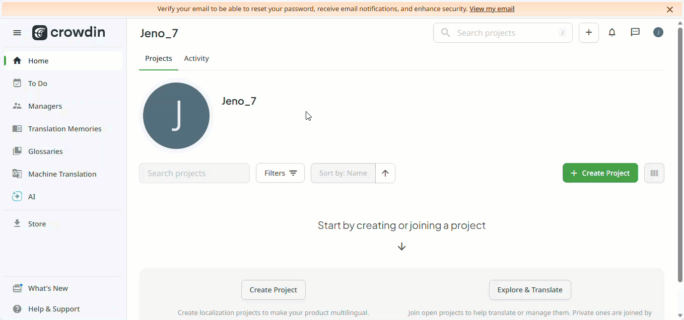 Selecteer het aangemaakte Crowdin en je wordt naar het projectdashboard gebracht.