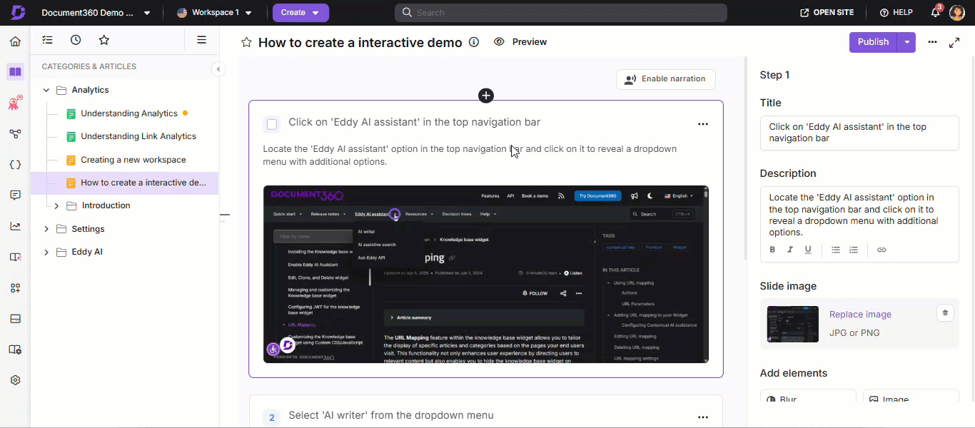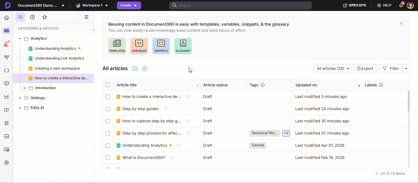Vanuit het paneel Categories & Articles kun je een stapsgewijze handleiding klonen binnen of tussen werkruimtes: