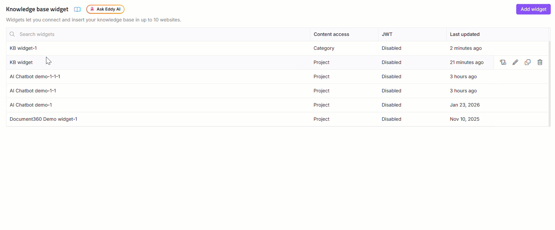 Beweeg je muis over de gewenste kennisbasis-widget en klik op het pictogram Bewerken () ().