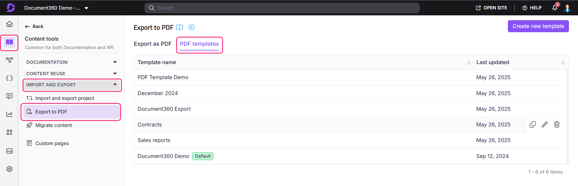 Create new template: Click the Create new template button at the top of the page to design and add new PDF templates to the list.