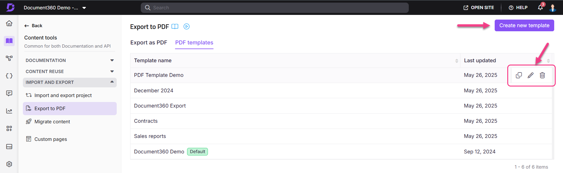 You can manage PDF templates on the overview page using the following actions. Individual controls are visible when you hover over a template: