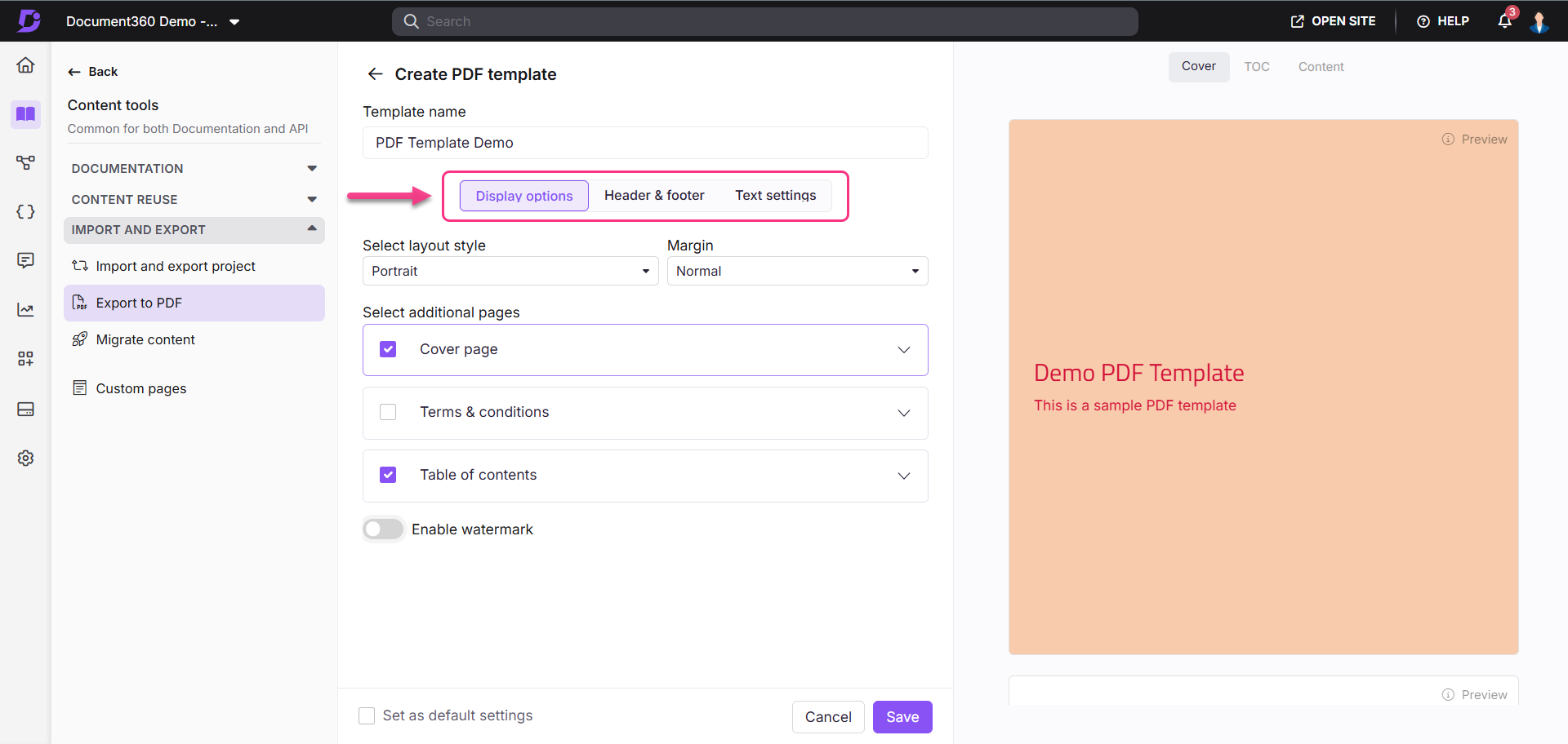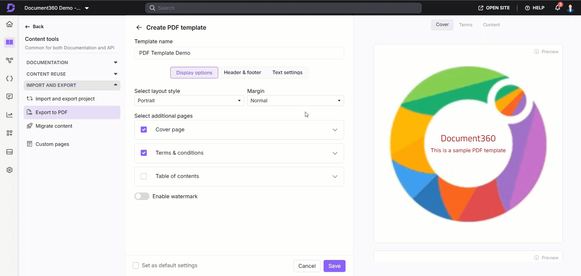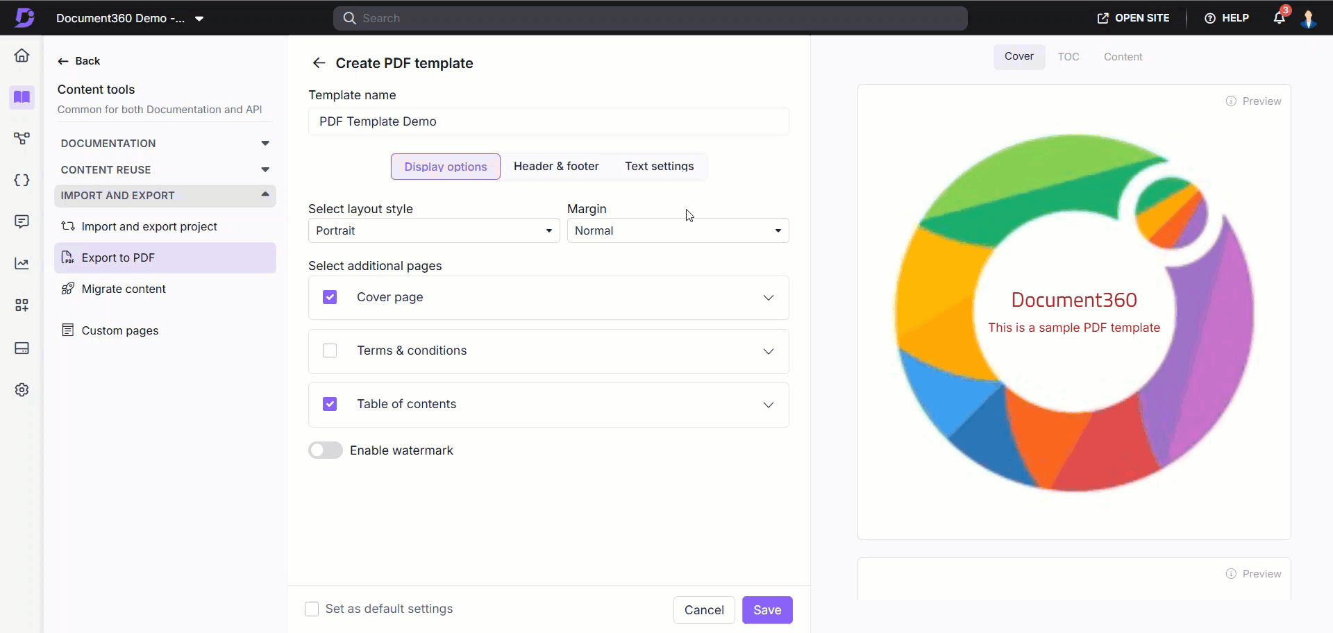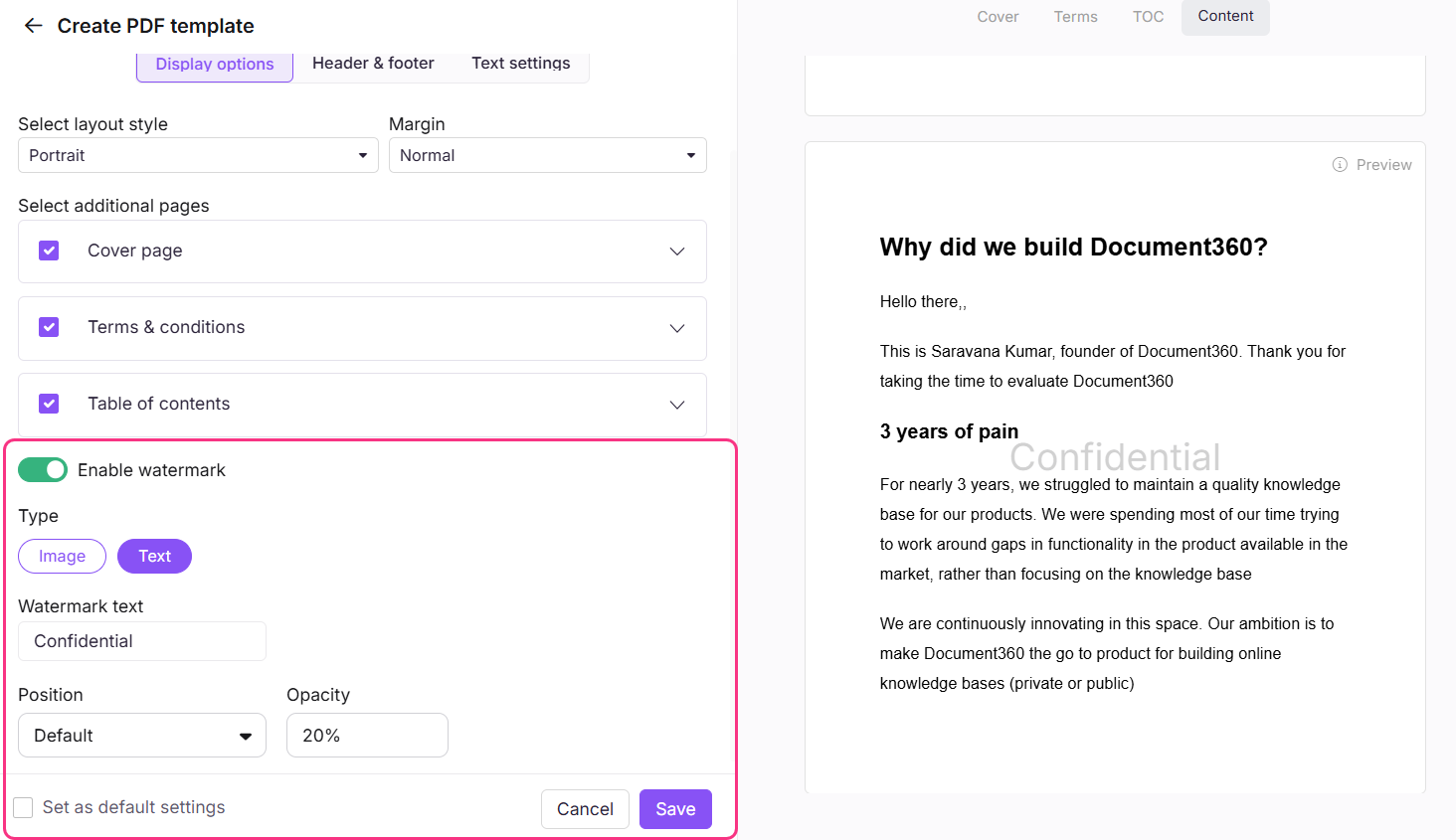 Enable the watermark option at the bottom of the settings page to include a watermark in your PDF.