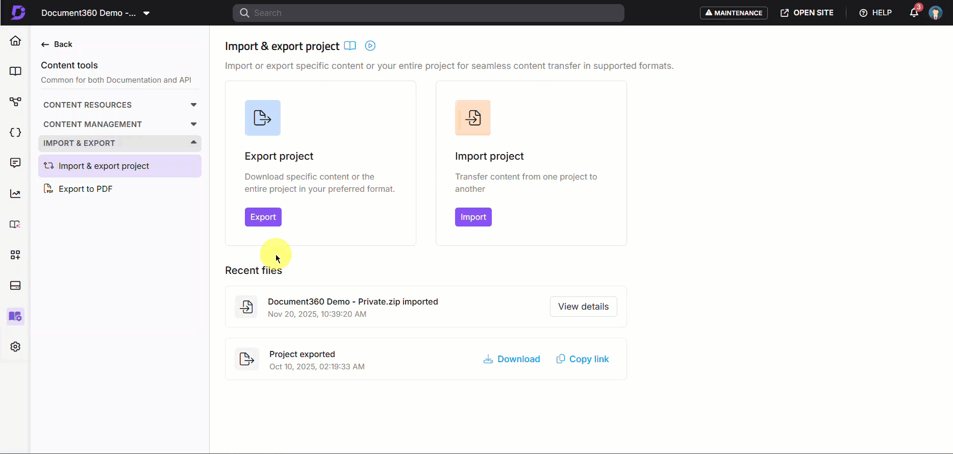 Para baixar o arquivo ZIP do projeto Document360 exportado,