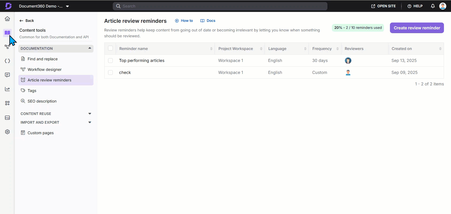 In the left navigation pane, navigate to Content tools > Documentation > Article review reminders.