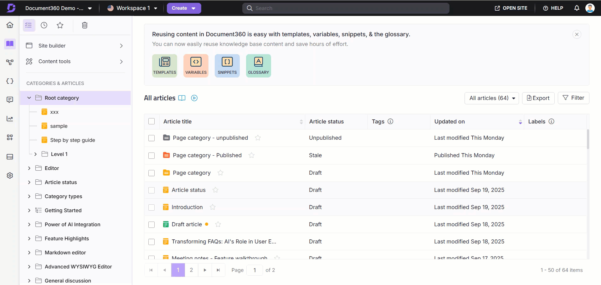 Create and apply review reminders to flag an article for review immediately or set the review reminder to trigger on a specified date. You can also apply a review reminder individually or to a group of articles. When an article needs review, a red badge (article status indicator) will appear on the left of each article title in the documentation editor.