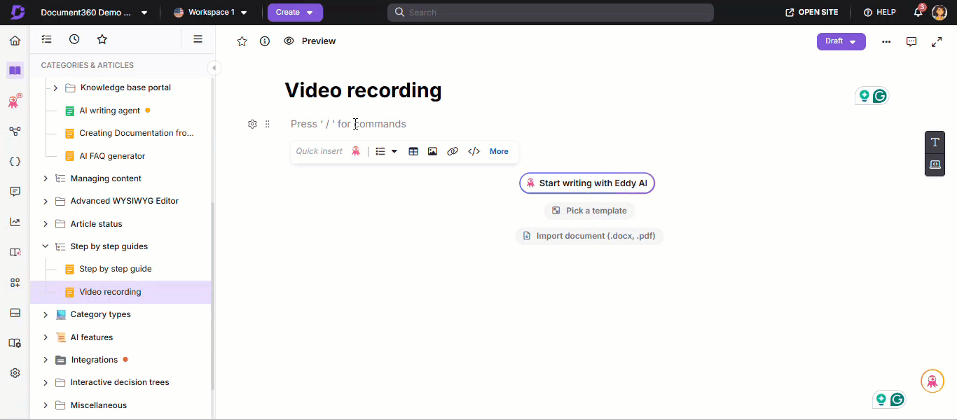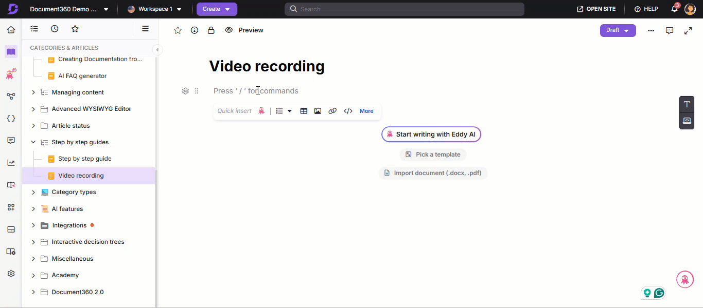 Document360 ofrece opciones integradas de grabación y formato de pantalla, permitiéndote capturar tu pantalla y mejorar el vídeo directamente dentro de tus artículos sin necesidad de herramientas externas.