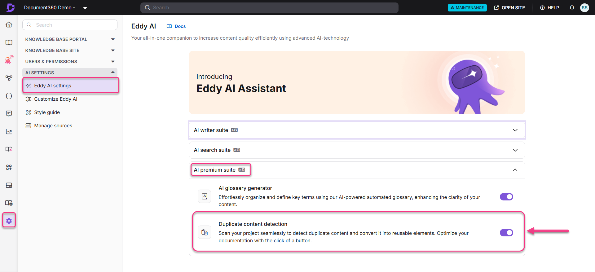 Dans le Knowledge base portal, allez dans () > Paramètres IA > Paramètres IA d'Eddy.
