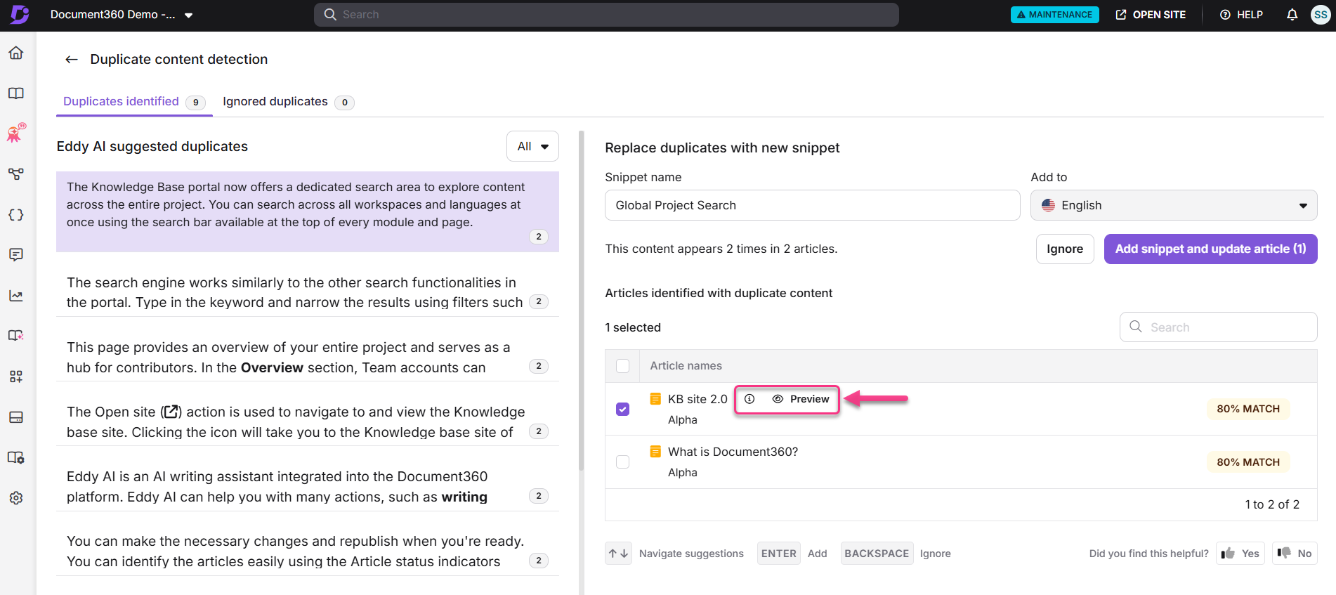 Pour simplifier ce processus, Document360 introduit la fonction de détection de contenu dupliqué , un système intelligent qui identifie et signale le contenu dupliqué sur l'ensemble de votre projet. Cela vous aide à détecter, examiner et gérer efficacement les informations répétées.
