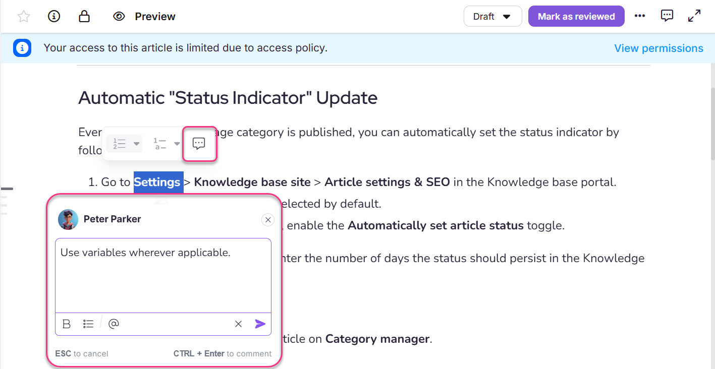 Le rôle de Reviseur dans Document360 permet aux utilisateurs de revoir le contenu sans modifier ni modifier. Ce rôle vise à simplifier la relecture de contenu en accordant des autorisations spécifiques aux Évaluateurs. Le rôle de Réviseur n’aura accès qu’au module Documentation , permettant de consulter les articles et catégories, d’ajouter des commentaires aux articles et de mettre à jour le statut du flux de travail de l’article.