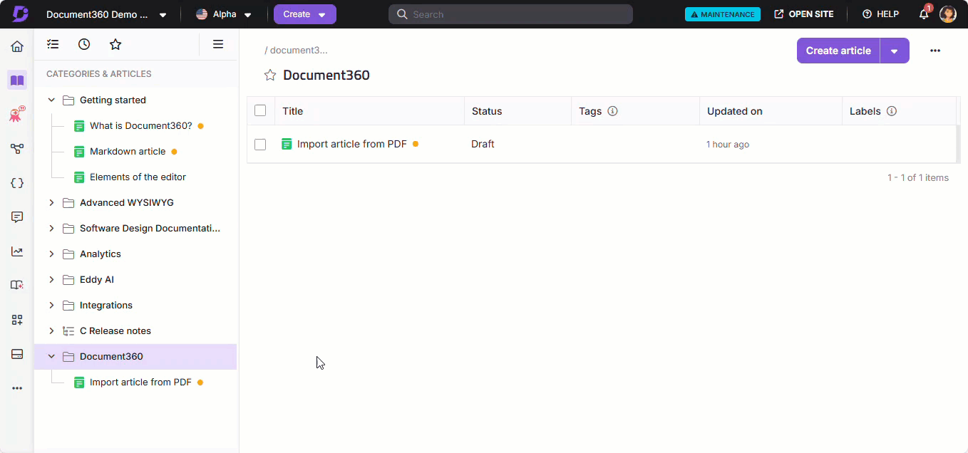 Om een .pdf bestand te importeren als een Document360-artikel:
