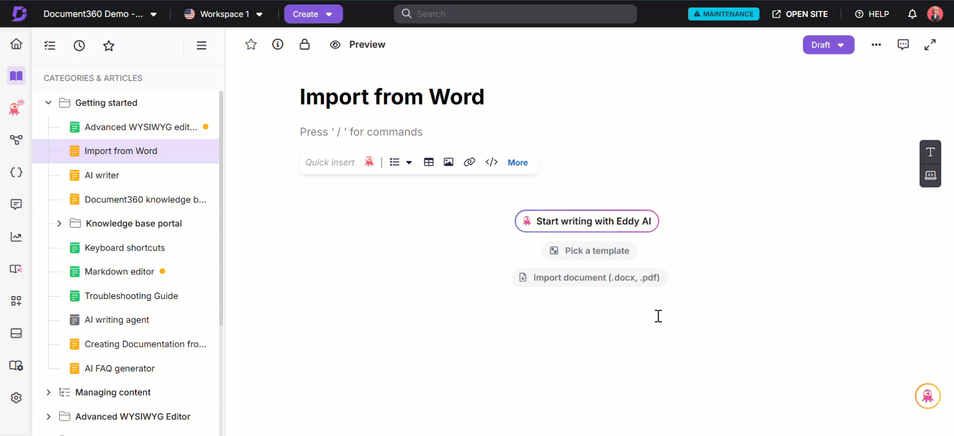 Add your pre-written content into Document360 by importing Word documents directly into the Advanced WYSIWYG editor: