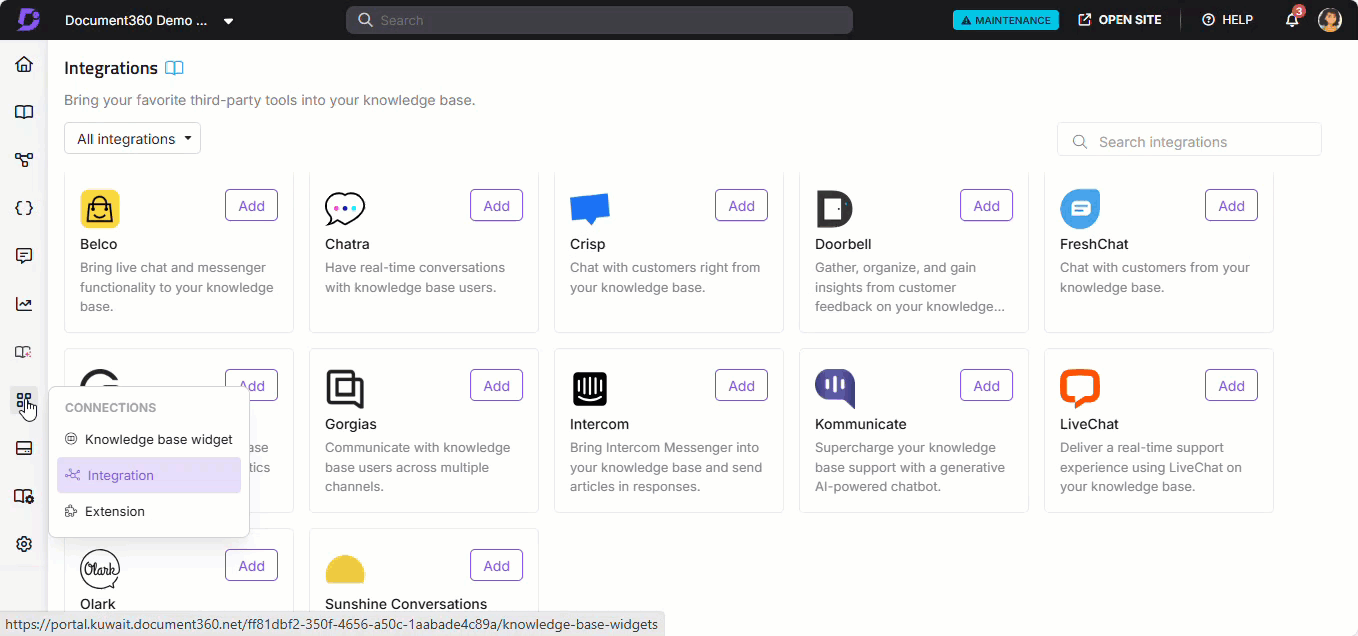 Navigate to Connections () > Integrations in the left navigation bar in the Knowledge base portal.