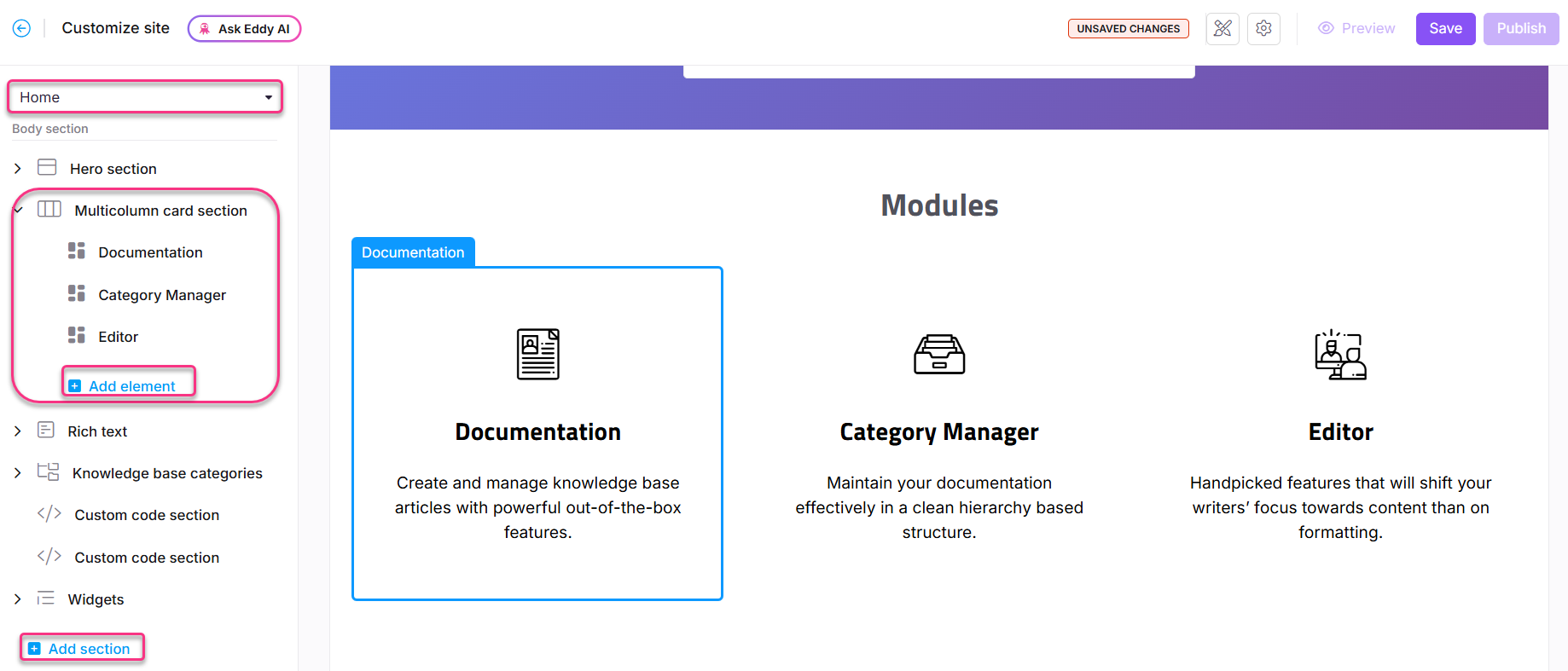 Om een multikolom-kaartsectie toe te voegen aan de Knowledge Base-site, volgt u de onderstaande stappen: