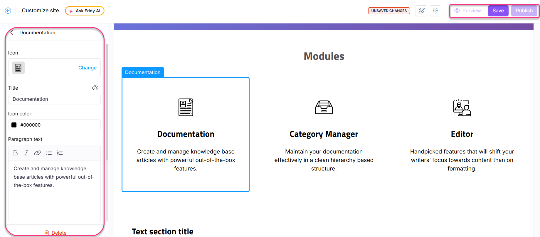 Klik op Preview om te zien hoe je wijzigingen op de kennisbanksite zullen verschijnen.
