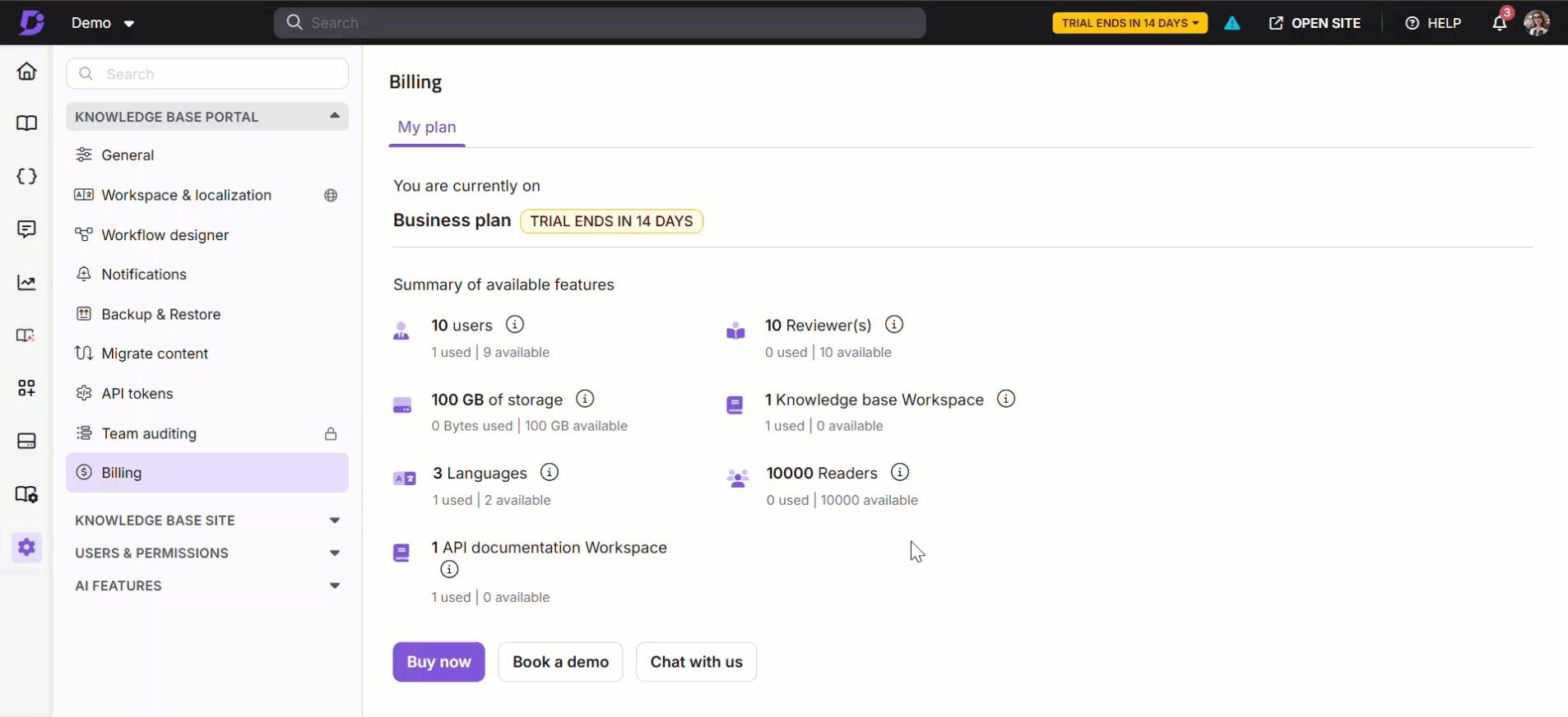 Tijdens de proefperiode kun je alle functies en plannen van Document360 verkennen om te bepalen welk abonnement het beste bij jouw behoeften past.