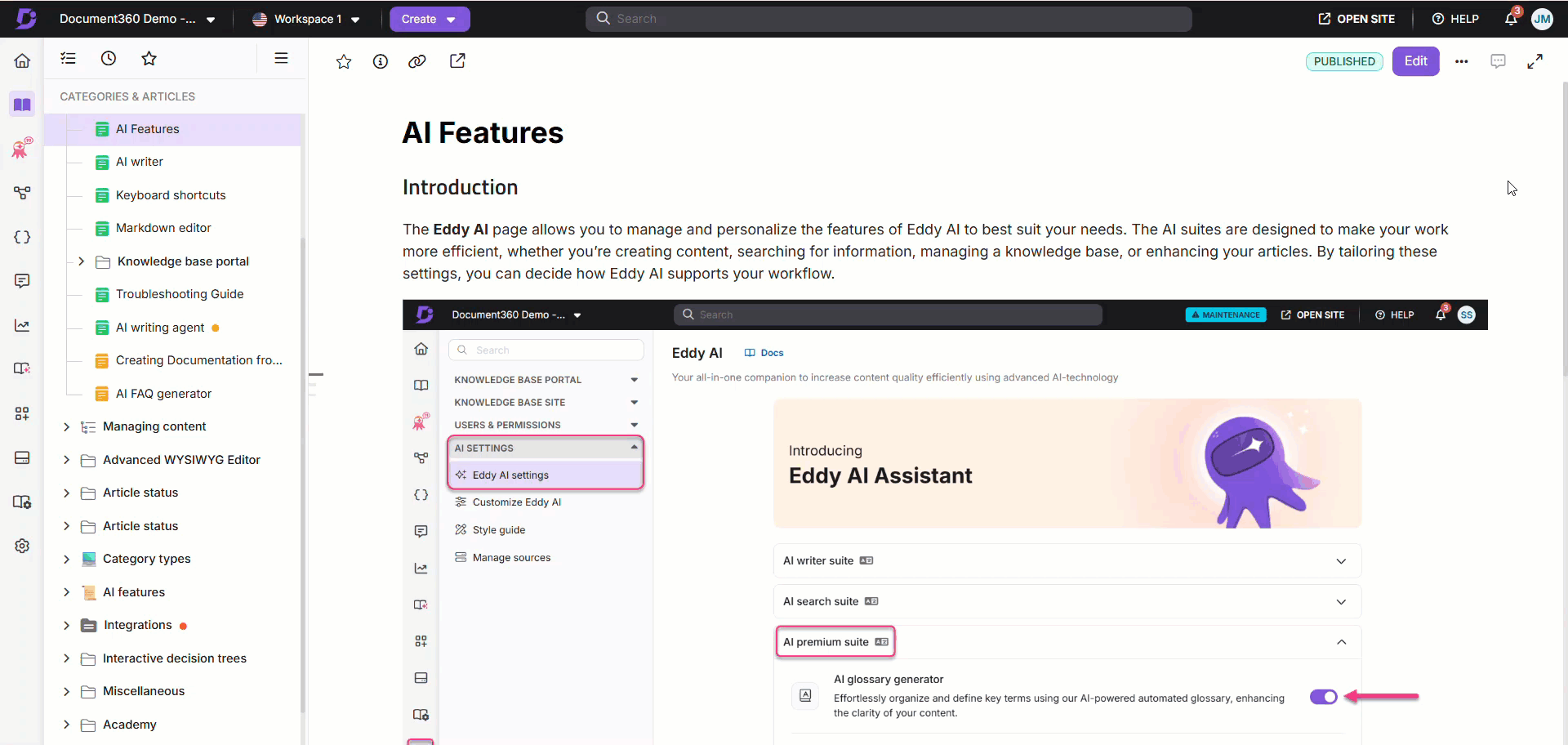 In Document360, when a user clicks the Edit button on a published article, a new unpublished version of that article is created. The old version is added to the article’s version history but remains available on the Knowledge base site until the new version is published.